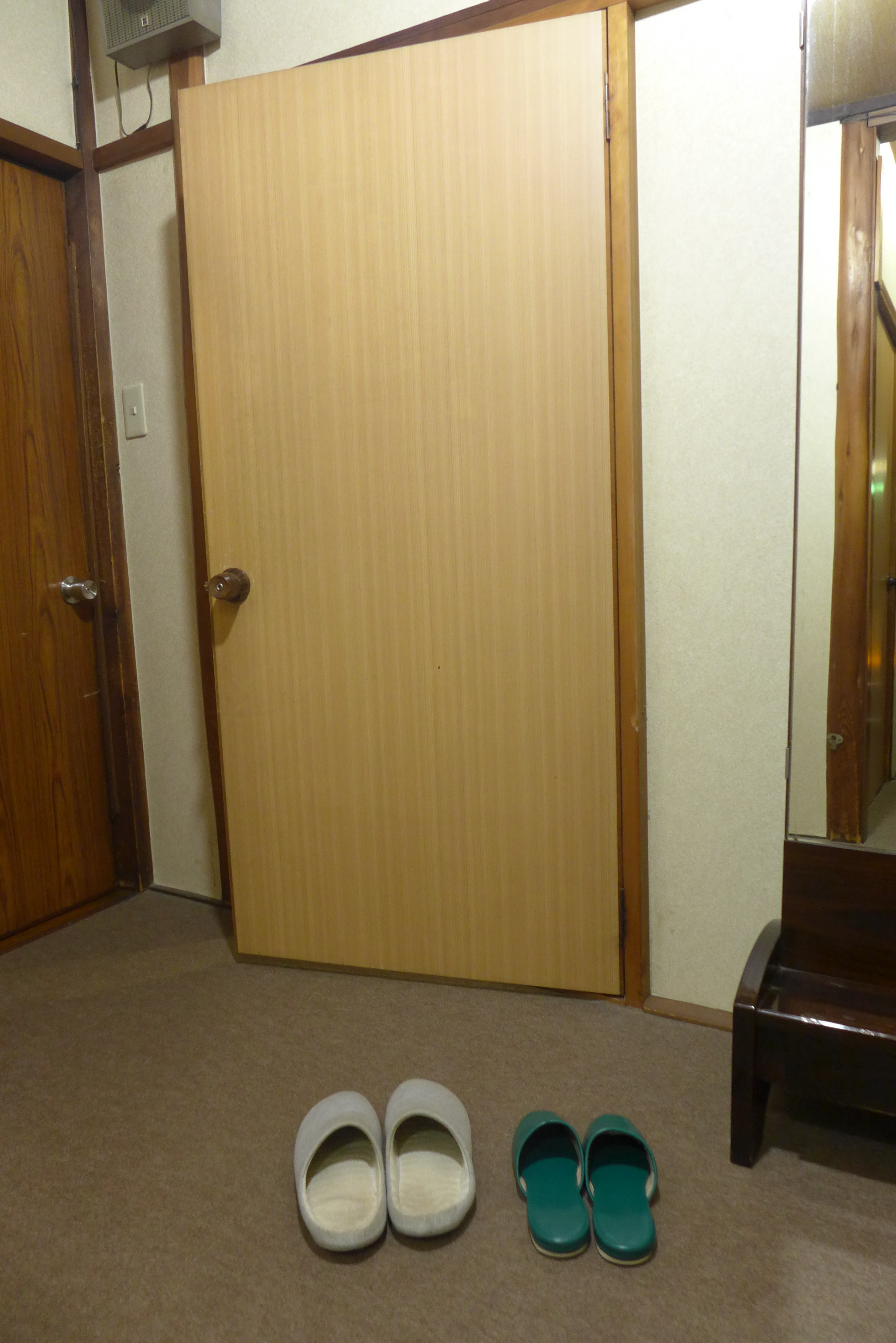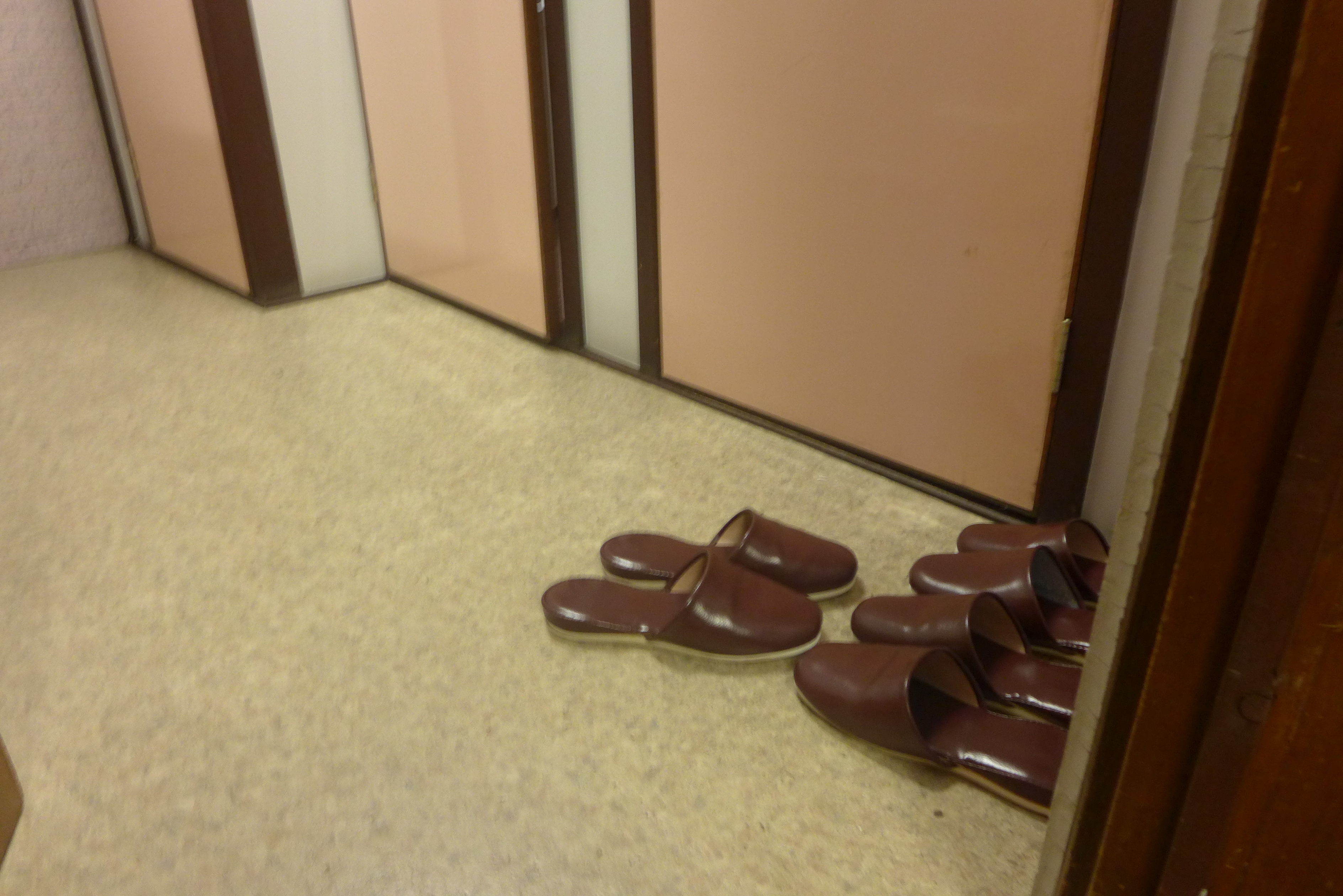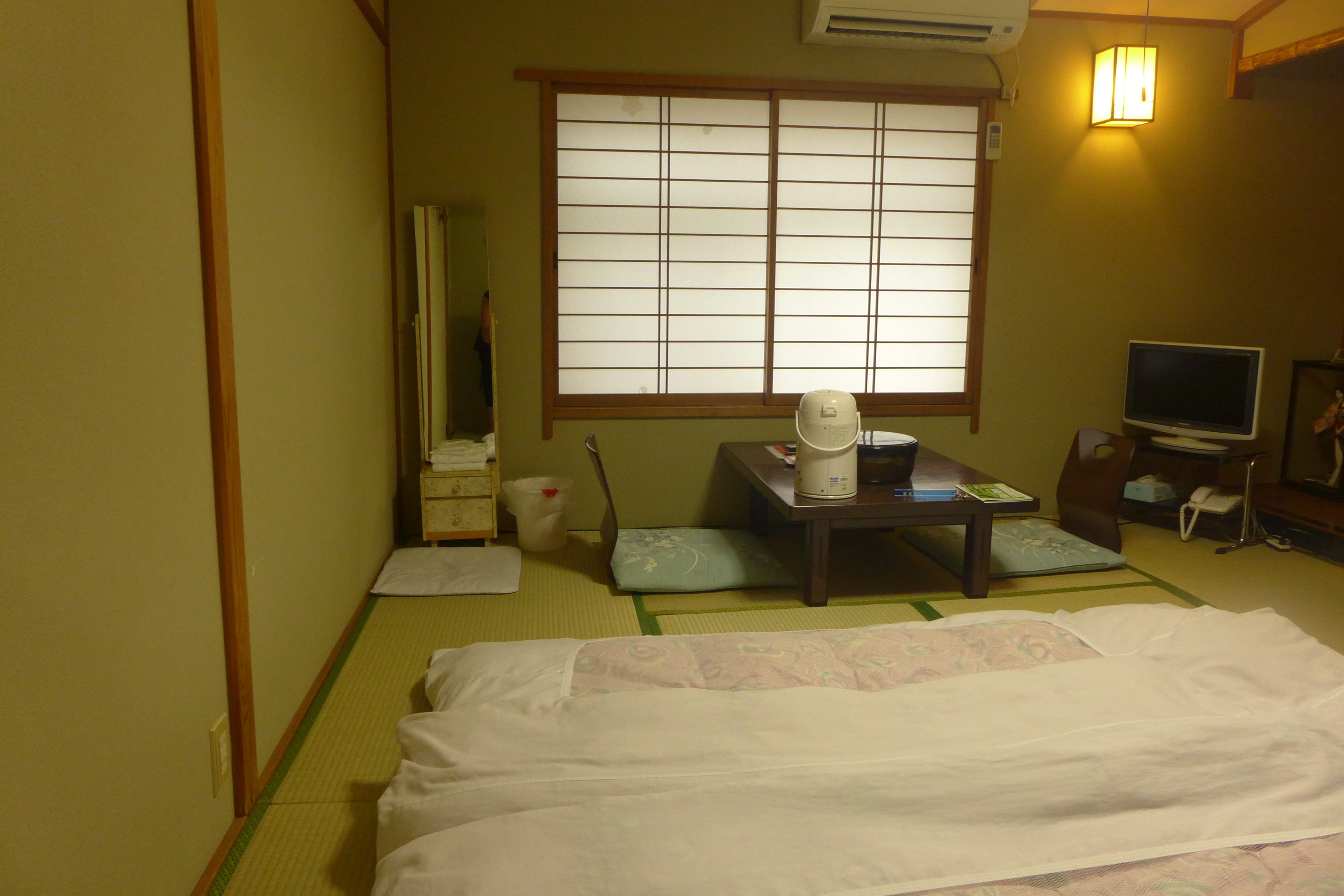 Nous nous doutions bien un peu de ce que notre riokan pour touristes -qui plus est à petit budget- ne présentait pas toutes les caractéristiques du genre; pour autant les tenanciers sont d’une gentillesse extrême et notre chambre de neuf tatamis (le double de celle du riokan de Tôkyô !) embaume la paille de riz de sorte que nous y sommes vraiment bien. Quant aux mules j’avoue, en dépit de l’amour que je porte au Japon, que le fait d’avoir à les enfiler, puis les quitter, puis les remettre, dix fois par jour n’est pas l’aspect le plus séduisant de ce merveilleux pays.
